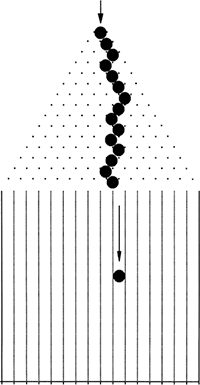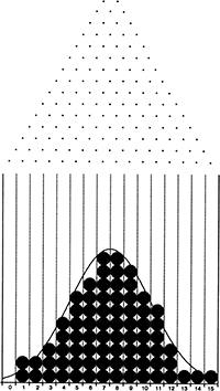 Движение шарика через частокол штырьков называют случайным блужданием. Как только шарик попадает в этот частокол, никто не может повлиять на его траекторию, равно как и предсказать эту траекторию. Если бросить достаточное количество шариков, то можно получить распределение, которое называется Гауссовым — большинство шариков попадает в центр игрового поля; чем дальше лунки расположены от центра, тем меньше шариков в них оказывается. Такое распределение называется еще нормальным или колоколообразным:
