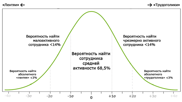 Если бросить бесконечно большое количество шариков, то распределение будет описываться колоколообразной кривой, изображенной на рисунке. Такая кривая симметрична (правая часть является зеркальным отражением левой), ее пик находится в центре, а хвосты всегда устремлены вниз и в стороны от центра. Если мы возьмем случайного сотрудника в рядовой компании и замерим, сколько времени он активно работает за компьютером в течение рабочего дня, то можем быть уверены в том, что с максимальной вероятностью он будет сотрудником средней активности, в меньшей степени вероятности, что он будет малоактивным или чрезмерно активным и в практически минимальной возможности – абсолютным «лентяем» или патологическим «трудоголиком».