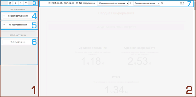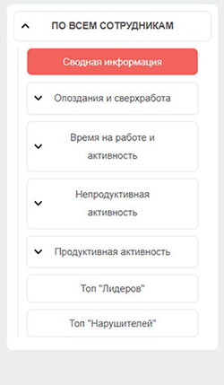 «Сводная информация» (открывается по умолчанию); «Опоздания и сверхработа»; «Время на работе и активность»; «Непродуктивная активность»; «Продуктивная активность»; «Топ Лидеров»; «Топ нарушителей». Сводная информация.Подраздел «Сводная информация» является основным и открывается по умолчанию при генерации отчета. Здесь перечислены основные значимые метрики для оценки поведения сотрудников в целом по компании, или иначе «Досье компании». Все таблицы и графики в подразделе отражают только ограниченное количество сотрудников, а для отображения полного списка необходимо кликнуть по заголовку (ТОП-20) и/или перейти в соответствующий подраздел. Опоздания и сверхработа.В данном разделе, информация на «Сводной странице» представлена в обобщенном виде, и в детальном виде – на всех остальных страницах подраздела. При раскрытии полного списка сотрудников в рамках той или иной таблицы – происходит переход на соответствующую страницу подраздела. Опоздания и ранние уходы – это когда сотрудник производит первый вход в систему после начала рабочего дня, и последний выход (проявляет последнюю активность) до окончания рабочего дня согласно установленному графику работы. Сверхработа – это ранние приходы до начала рабочего дня и поздние уходы после окончания рабочего дня. Переработки – это положительная разница между Сверхработой и Опозданиями, а Недоработки – положительная разница между Опозданиями и Сверхработой. Так как один сотрудник может в некоторые дни опаздывать, а в другие дни - приходить пораньше, наличие одновременно Опозданий и Сверхработы – является нормой. Все параметры в разделе являются средними по количеству отработанных сотрудником дней. Время на работе и активность.В разделе содержится различные параметры ежедневной активности сотрудников: Активность – количество времени ежедневной активной работы (с использованием кнопок мыши и клавиш клавиатуры). Программы – количество времени ежедневной активной работы в любых приложениях. Работа с текстом – это количество в тысячах символов ежедневной работы с текстом: набираемого с клавиатуры и вставляемого из буфера обмена. E-mail – количество ежедневно отправляемых и получаемых электронных писем. Сообщения / звонки – количество ежедневно отправляемых и получаемых сообщений в мессенджерах, совершаемых звонков. Печать на принтере – количество ежедневно отправляемых на печать документов (в том числе на виртуальные принтеры PDF). Отправка файлов – количество ежедневно отправляемых или выводимых за пределы компании файлов, вложений. Непродуктивная активность.В этом разделе содержатся параметры ежедневной или суммарной за период непродуктивной активности сотрудников: Всё время – суммарное количество времени, затраченного на работу с ресурсами и веб-сайтами из числа «Вредных» словарей соответствующего профиля сотрудника (суммарная непродуктивная активность). Среднее время – количество времени ежедневной непродуктивной активности. Поиск работы – это суммарное количество времени, проведенное сотрудником на сайтах поиска работы. Продуктивная активность.Продуктивная активность – это количество времени ежедневной продуктивной активности сотрудника (на ресурсах и сайтах, связанных с исполнением служебных задач). Согласно настройкам «Полезных» словаре