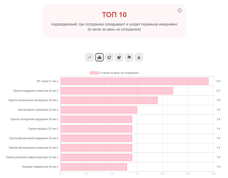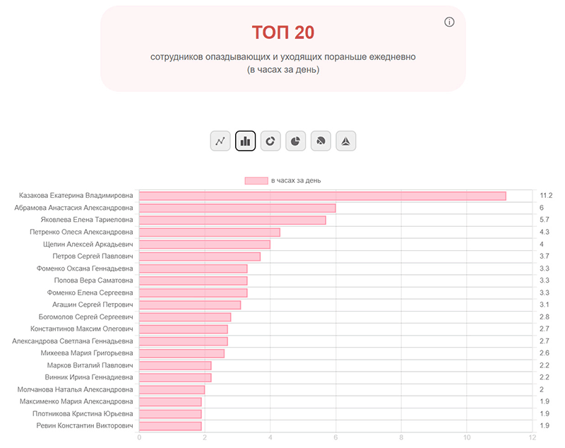 Верхний заголовок «ТОП 20» интерактивный, при клике - переносит пользователя на страницу с полным перечнем сотрудников, отсортированных в порядке по убыванию или возрастанию показателей. В средней части представлены шесть иконок, при клике на которые, меняется внешний вид графика. По умолчанию отображается вид гистограммы. В данном случае параметры графика опозданий представлены в часах за день с десятичной дробью. Например, нижнее значение 1.9 часа означает, что в среднем ежедневно сотрудник опаздывает на 1 час 54 минуты. Так как показатель усредненный, значит в некоторые дни сотрудник может опаздывать условно на 3 часа, в другие дни на 30 минут, а в иных случаях и вовсе не опаздывать. Итоговый усредненный показатель формируется за длительный период, за который сгенерирован отчет. У каждого сотрудника своё значение по параметру и отображается оно в правой части графика напротив фамилии соответствующего сотрудника. Аналогичного вида графики могут отображать не только среднее время опозданий, но и среднее количество отправляемых сотрудником писем (в единицах), напечатанных документов и др. Приведенный график может быть применен не только к сотрудникам, но и к подразделениям.