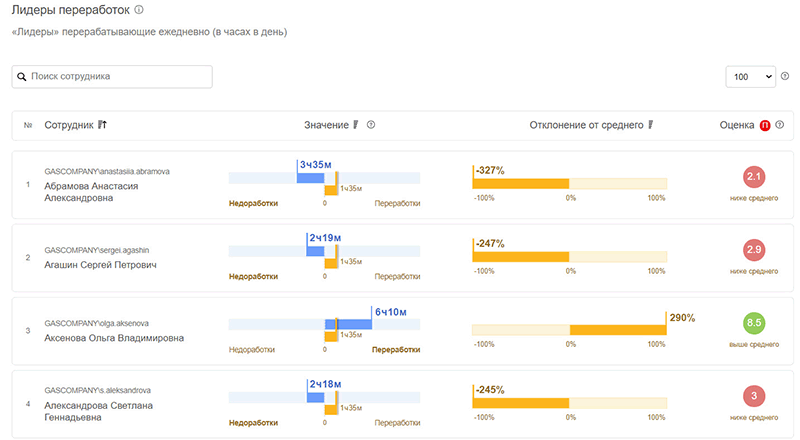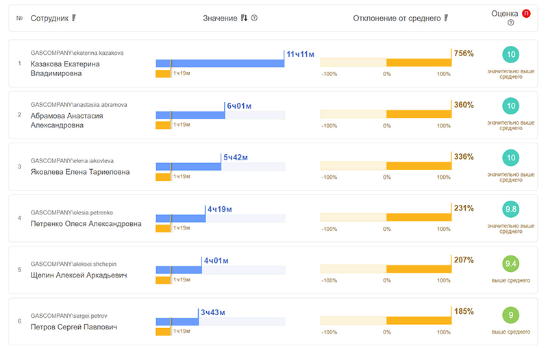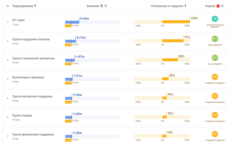 Во втором столбце (Подразделение) указано название и количество человек в подразделении. Под синим цветом в столбце «Значение» отражается средний ежедневный (иногда суммарный за все дни) показатель среднего сотрудника подразделения, желтым цветом – показатель среднего сотрудника среди всех подразделений. В столбце «Отклонение от среднего» показано, насколько значение среднего сотрудника определенного подразделения отличается от значения среднего сотрудника среди всех подразделений. Столбец «Оценка» указывает условный балл среднего сотрудника подразделения, а также дает оценку, насколько этот балл отличается от среднего значения среди сотрудников всех подразделений. По умолчанию в таблице отображается не более 100 строк (сотрудников или подразделений).