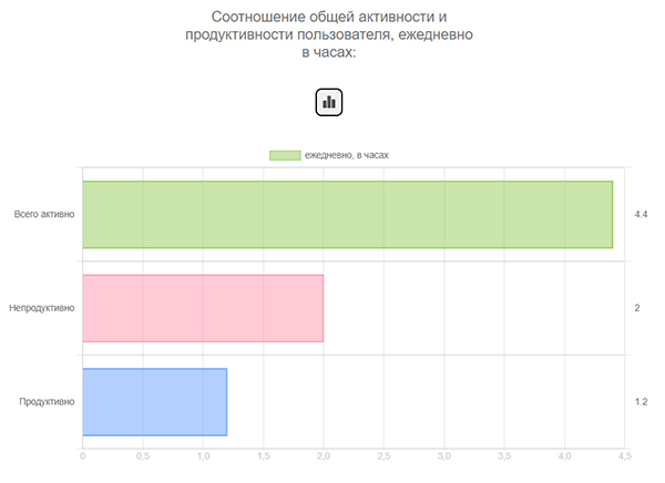 В таблице «Переработок» в столбце 2 («Значения») недоработками считаются значения по левую сторону от нулевой точки. В качестве подсказки в этом случае слово «Недоработки» выделено жирным шрифтом. Если же значения направлены по правую сторону от нулевой точки и при этом жирным шрифтом выделено слово «Переработки», соответственно речь идет о количестве переработок. На примере мы видим, что среднее значение среди всех сотрудников этой компании - 1 час 35 минут ежедневных переработок. График соотношения «активности и продуктивности пользователя» представлен в Досье сотрудника.
