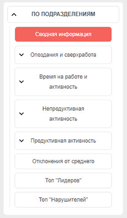 «Сводная информация»; «Опоздания и сверхработа»; «Время на работе и активность»; «Непродуктивная активность»; «Продуктивная активность»; «Отклонения от среднего»; «Топ Лидеров»; «Топ нарушителей». Существует два способа отображения и калькуляции данных среди подразделений: по иерархии и по отделам. Для отображения по иерархии и/или по отделам, необходимо произвести соответствующие настройки. Переключение режимов доступно в информационном меню контентного блока. Описание раздела «По всем сотрудникам» во многом применимо к описанию раздела «По подразделениям», однако между ними существуют и некоторые различия. Опоздания и сверхработа.Опоздания и ранние уходы – это когда средний сотрудник подразделения производит первый вход в систему после начала рабочего дня, и последний выход - до окончания рабочего дня согласно установленному графику работы. Сверхработа – это ранние приходы среднего сотрудника подразделения до начала рабочего дня и поздние уходы после окончания рабочего дня. Переработки – это положительная разниц между Сверхработой и Опозданиями среднего сотрудника подразделения, а Недоработки – положительная разница между Опозданиями и Сверхработой. Все параметры в разделе являются средними по количеству отработанных сотрудником дней и средними по количеству сотрудников в подразделении, иными словами, ежедневные показатели среднего сотрудника подразделения. Средние значения (выделены желтым цветом) вычисляются по всем подразделениям, и являются ежедневным показателем среднего сотрудника в компании, среди всех подразделений. Время на работе и активность.В разделе содержится различные параметры ежедневной активности среднего сотрудника подразделения. Активность – количество времени ежедневной активной работы среднего сотрудника подразделения (с использованием кнопок мыши и клавиш клавиатуры). Программы – количество времени ежедневной активной работы среднего сотрудника подразделения в любых приложениях. Работа с текстом – это количество в тысячах символов ежедневной работы с текстом среднего сотрудника подразделения: набираемого с клавиатуры и вставляемого текста из буфера обмена. E-mail – количество ежедневно отправляемых и получаемых электронных писем средним сотрудником подразделения. Сообщения / звонки – количество ежедневно отправляемых и получаемых сообщений в мессенджерах, совершаемых звонков средним сотрудником подразделения. Печать на принтере – количество ежедневно отправляемых на печать документов (в том числе на виртуальные принтеры PDF) средним сотрудником подразделения. Отправка файлов – количество ежедневно отправляемых или выводимых за пределы компании файлов, вложений средним сотрудником подразделения. Непродуктивная активность.В этом разделе содержатся параметры ежедневной или суммарной за период непродуктивной активности сотрудников: Всё время – суммарное количество времени, затраченного средним сотрудником подразделения на работу с ресурсами и веб-сайтами из числа «Вредных» словарей соответствующего профиля сотрудника (суммарная непродуктивная активность среднего сотрудника подразделения). Среднее время – количество времени ежедневной непродуктивной активности среднего сотрудника подразделения. Поиск работы – это суммарное количество времен
