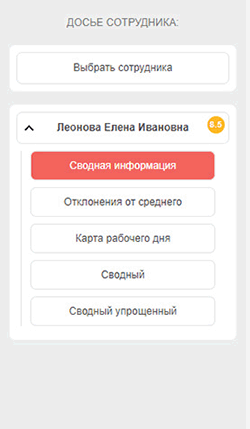 «Выбрать сотрудника», «Сводная информация»; «Отклонения от среднего»; «Карта рабочего дня»; «Сводный»; «Сводный упрощенный», а также отображает общий балл «Лидерства». Выбрать сотрудника.Для того, чтобы просмотреть досье по сотруднику, необходимо перейти в подраздел «Выбрать сотрудника», затем выбрать необходимого сотрудника из списка. При необходимости можно воспользоваться поиском или фильтром. После выбора сотрудника, карта его досье отобразится в навигационном меню под разделом «Выбрать сотрудника» и по нему откроется «Сводная информация». При необходимости указанным выше способом можно добавить и других сотрудников для отображения в навигационном меню. Также можно закрыть в навигационном меню карточку любого сотрудника, кликнув на изображение крестика в верхнем правом углу карточки сотрудника (отображается при наведении курсора). В верхнем правом углу карточки сотрудника отображается его балл «Лидерства» (вовлеченности). Сводная информация.В этом разделе реализован принцип профилирования сотрудника на основе полной картины данных о его продуктивной и непродуктивной активности, посещении интернет-ресурсов, относящихся к различным категориям, а также иным показателям продуктивности. Сводная информация в «Досье сотрудника» включает: