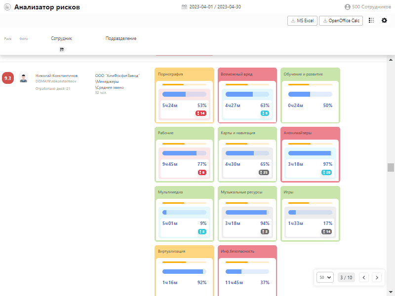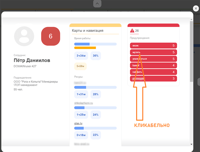 По каждой категории отображается суммарное активное время в той или иной категории. По любой из категорий словаря можно кликнуть мышью и узнать подробности активности сотрудника, то есть детализировать значения, по которым информация классифицировалась. При работе с отчетом есть два режима просмотра информации: Если в отчете только один сотрудник, то автоматически включается страничный режим. В табличном режиме доступна сортировка по времени и по кол-ву предупреждений. А также в любом режиме по столбцам "Риск", "Сотрудник", "Подразделение". Предупреждения в категории по сотруднику бывают 3-х видов в зависимости от типа категории (полезная/нейтральная/вредная): зеленые/серые/красные соответственно: Оранжевая линия показывает среднее значение времени по всем сотрудникам в отчете по определенной категории (от 0 до 100%): Интерфейс модального окна.