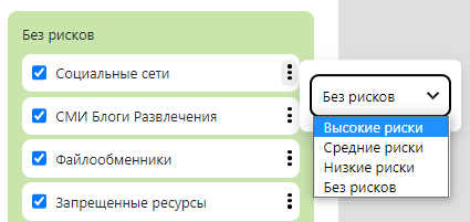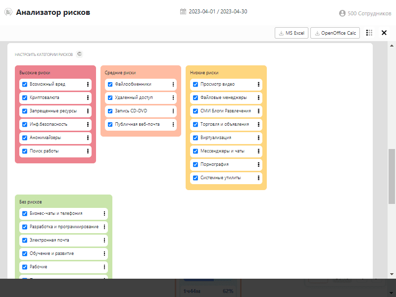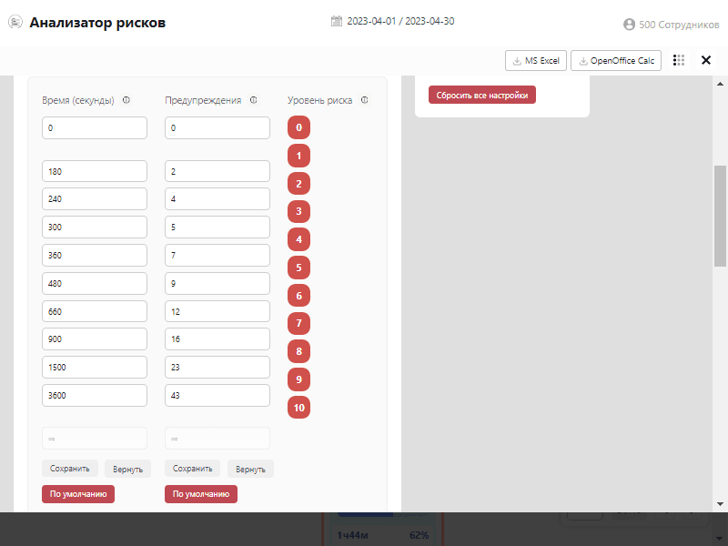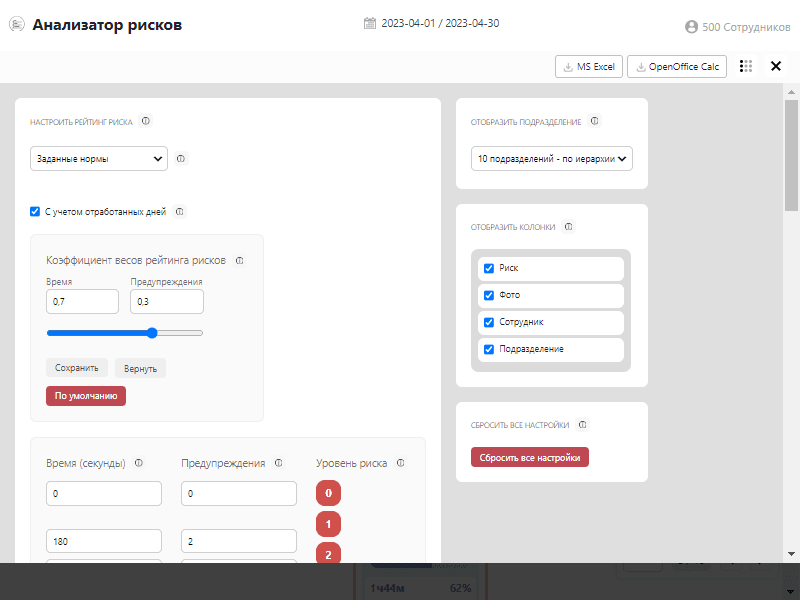При первой генерации отчета, "Вредным" словарям автоматически присваивается категория со средним уровнем риска (оранжевый цвет), а "Полезным", прочим и не определенным словарям присваивается категория без риска (зеленый цвет). Для более точного определения рейтинга рисков, необходимо распределить словари, опираясь на политики организации или в соответствии с актуальными задачами оценки рисков. Указанные настройки будут применены для всех сотрудников. Но если словарь относится к "полезным" в профиле отдельного сотрудника, уровень риска для него будет нулевым. При деактивации галочки, колонка со словарем будет скрыта, а риск пересчитан, исключая деактивированный словарь. Внимание! Чтобы изменения вступили в силу, перед выходом из веб-настроек отчета необходимо сохранить настройки. ![]() Задать категории уровень риска можно в соответствующем меню: Для отображения балла риска на главной странице, стоит убедиться, что в настройках выбрана колонка "риск" для показа: Для сброса всех веб-настроек отчета, нужно нажать на соответствующую кнопку: Вид отображения информации в столбце "Подразделение", можно выбрать в соответствующем меню (по иерархии или по отделам/должностям): Настройки рейтинга рисковМетод расчета рейтинга риска можно выбрать в соответствующем меню ("заданные нормы", "параметрический" или "непараметрический" метод): При активации опции "С учетом отработанных дней" риски рассчитываются пропорционально количеству отработанных дней индивидуально для каждого пользователя.