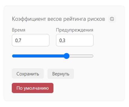 При деактивации - риски рассчитываются исходя из расчета за весь временной период отчета без учета количества отработанных дней. Коэффициент весов рейтинга рисков определяет, насколько тот или иной параметр пропорционально влияет на расчет рисков: время, проведенное пользователем в ресурсах словарей или совпадения с заданными словами словарей (предупреждения). При этом в сумме веса равны единице. Только для метода Заданных норм, можно задать границы норм времени, проведенного в ресурсах словарей и количества совпадений с заданными словами словарей (предупреждений). Нормы задаются из расчета на 20 дней (примерно один месяц работы). Если учет рабочих дней не активирован, нормы задаются из расчета за весь временной период отчета. Если выбран "Непараметрический" или "Параметрический" метод расчета рейтинга рисков, значения, заданные в этом блоке настроек, будут игнорироваться. Внимание! Чтобы изменения вступили в силу, перед выходом из веб-настроек отчета необходимо сохранить настройки в соответствующем блоке по клику на кнопку "Сохранить". |