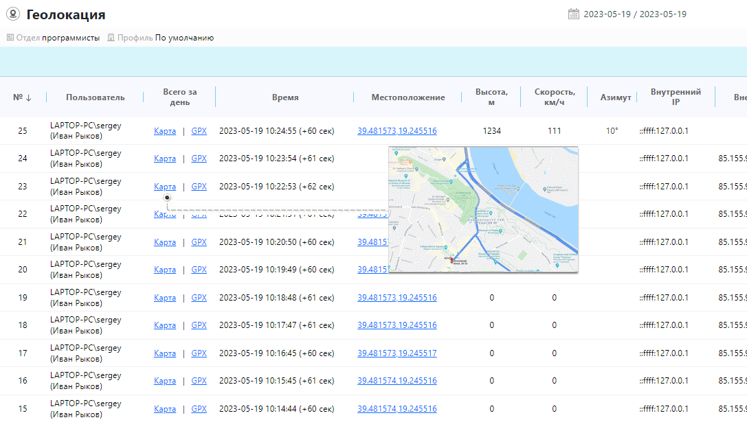 ГеолокацияОтчёт отражает статистику по местонахождению, передвижениям и остановкам выбранных сотрудников за указанный период. По итогу дня, имеется возможность построения визуального маршрута на картах Google с экспортом в .gpx-формат.