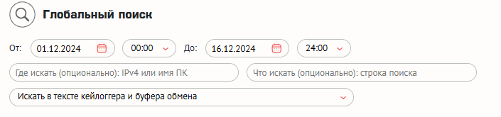 Глобальный поискОтчет позволяет производить глобальный поиск по всей базе данных для поиска слов кейлоггера, заголовка окна, домена посещенного сайта, исполняемого файла приложения, описания приложения, текста в буфере обмена.Для работы отчет должен быть включен и произведены настройки на странице настроек.