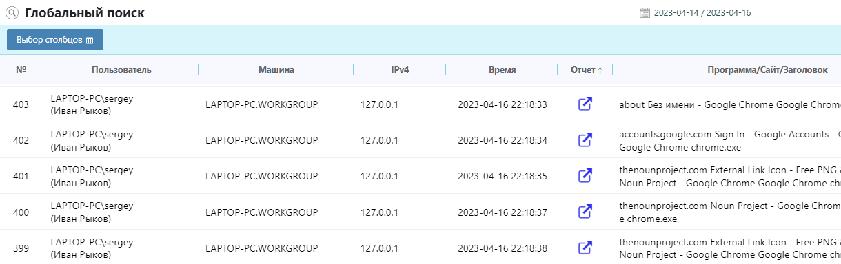 - домен+логин сотрудника, опционально его ФИО; - ПК сотрудника и его IP; - время события с возможностью перейти на ближайший скриншот в отчете "Снимки экранов"; - домен посещенного сайта, заголовок окна приложения, описание приложения, исполняемый файл приложения; - текст кейлоггера или текст буфера обмена. Внимание! Данные результата отсортированы по времени событий (сначала самые последние) и показывается не более N-результатов (обычно 500). |