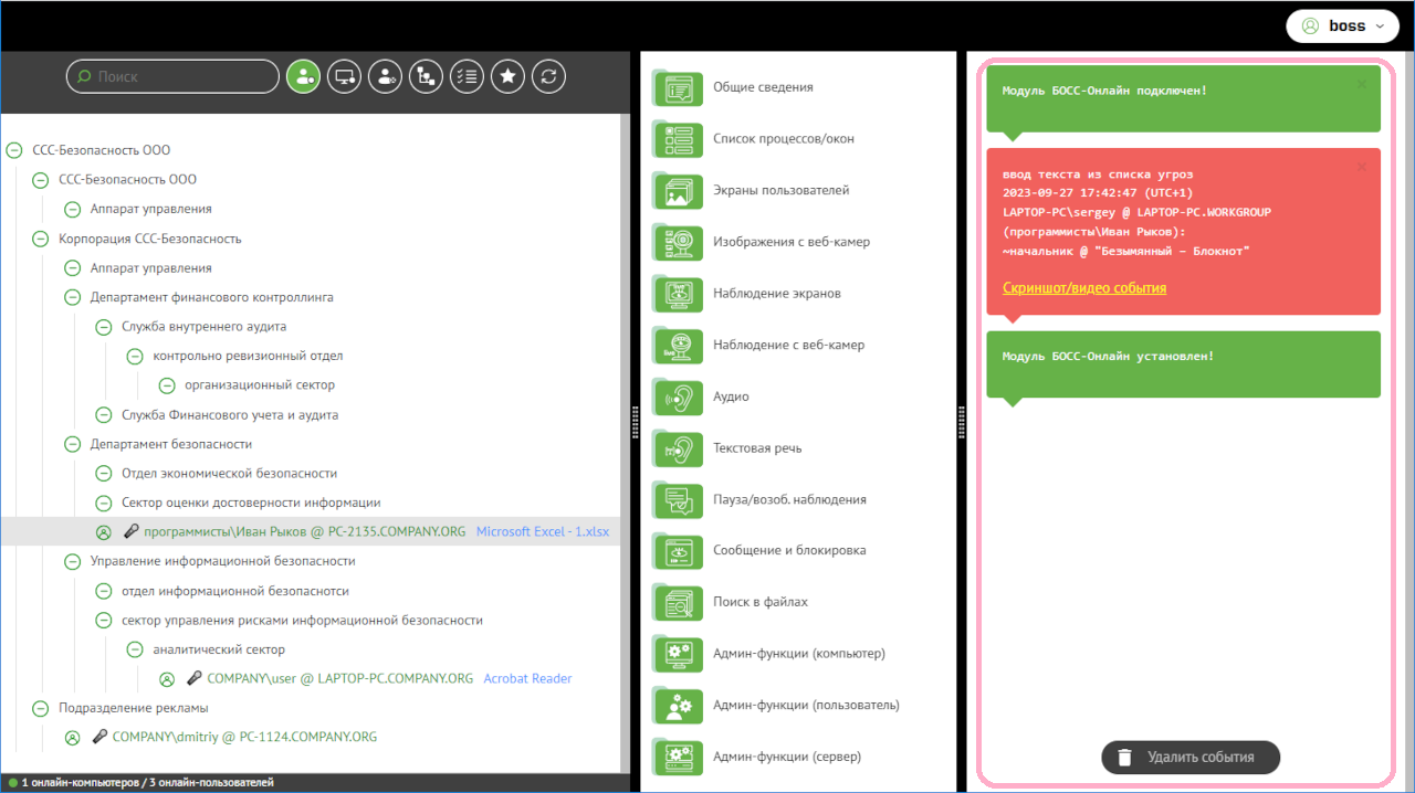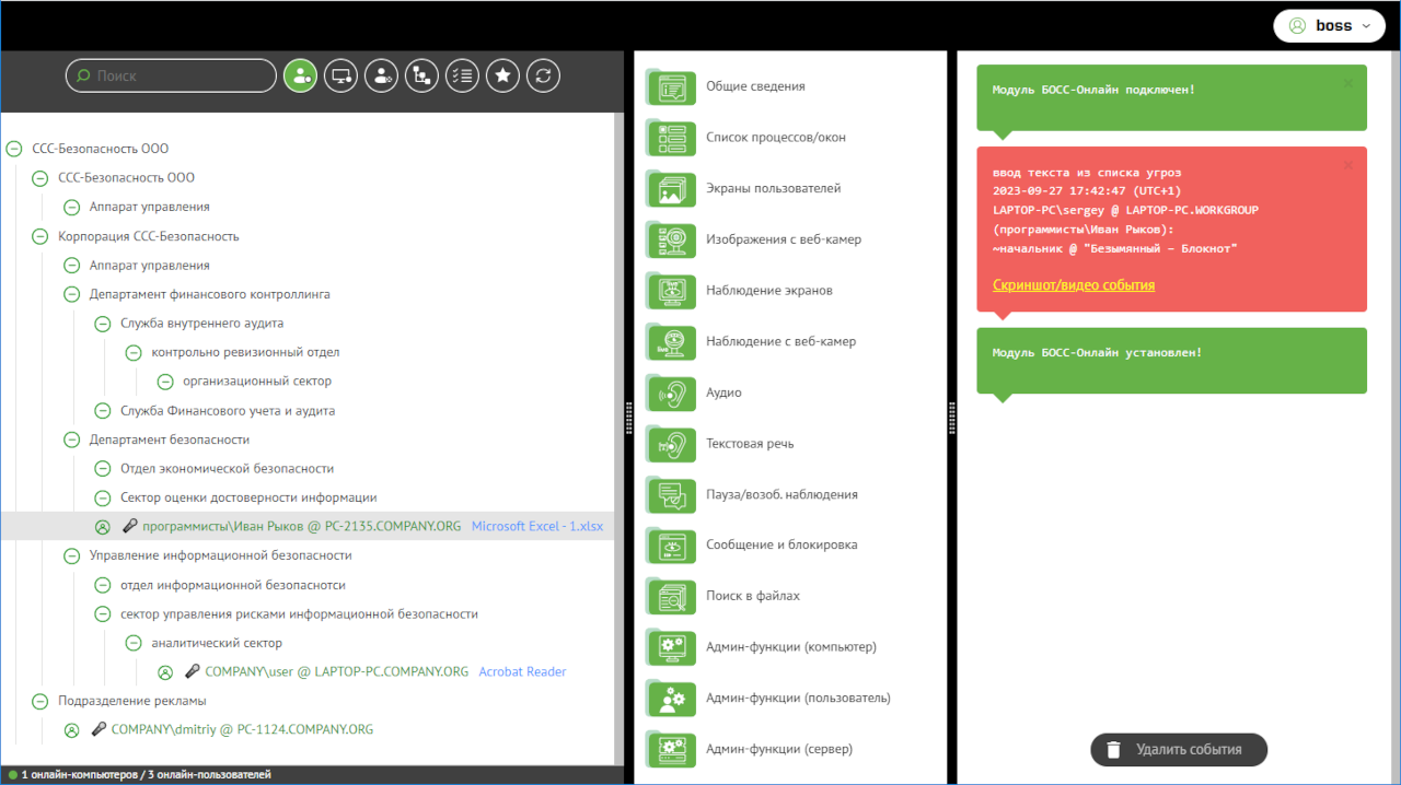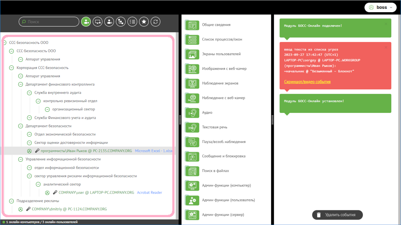 Для использования аудио-функций мониторинга пользователей в БОСС-Онлайн, требуется установка специального модуля. Предупреждение об отсутствии модуля и ссылка на его скачивание появится в правом окне событий. Необходимо будет скачать и установить модуль. При установке модуля у вас на рабочем столе должен создаться ярлык с именем вида "БОСС-Онлайн (92C8BA68)" и в трее появиться такая же иконка. Для активации возможностей модуля в БОСС-Онлайн необходимо каждый раз заходить через этот ярлык на рабочем столе или двойным кликом по иконке в трее. ![]() Удалить модуль БОСС-Онлайн можно через клик правой кнопкой мыши в трее на значок модуля и выбрать - "Удалить модуль". Левое окно ![]() В левом окне в нижней части окна отображается количество онлайн-компьютеров и онлайн-пользователей. Тут удобно отслеживать расходование ваших лицензий - число пользователей онлайн не должно превышать приобретенного числа лицензий, в противном случае система будет выдавать ошибку о превышении числа лицензий. ![]() Для более наглядного отображения, Вы можете распределить пользователей согласно иерархической структуре в вашей компании, с указанием отделов, подразделений и т.д. (Создание структуры осуществляется в Глобальных настройках). Иерархия используется при отображении не только в БОСС-Онлайн, но и в БОСС-Оффлайн, и очень удобна для задания прав доступа начальникам к своим отделам. Для выбора нескольких пользователей зажмите Ctrl на клавиатуре и мышкой укажите нужных пользователей. Для выбора всех пользователей внутри структурной единицы дважды кликните по любому из пользователей внутри этой структурной единицы. Если же иерархия компании у вас не настроена, то двойной клик по одному из пользователей выделит сразу всех. В верхней части окна присутствуют вкладки: "Просмотр онлайн-пользователей" - вкладка, открытая по умолчанию. Отображает онлайн-пользователей согласно указанной вами иерархической структуре. ![]() "Просмотр онлайн-компьютеров" - отображение онлайн-компьютеров согласно указанной вами иерархической структуре. ![]() Обратите внимание! Находясь на данной вкладке, становятся недоступны ряд кнопок управления: ![]() "Просмотр оффлайн-пользователей (не в сети)" - отображение пользователей, находящихся в данный момент не в сети. Обратите внимание! только на этой вкладке отображаются мобильные клиенты и время их последней синхронизации. ![]() "Только отделы / Развернуть все" - позволяет сделать вид дерева иерархии более компактным. ![]() "Мультивыделение" - включение или отключение режима мультивыделения в дереве иерархии. ![]() "Пользовательские списки" - интерфейс для редактирования часто-используемых списков пользователей/ПК, для быстрой выборки с постоянными группами пользователей/ПК без необходимости каждый раз выбирать их вручную. ![]() "Поиск" - поиск осуществляется по имени учетной записи/ФИО/имени ПК. ![]() "Обновить список" - функция обновления отображаемой вкладки. ![]() Правое окно ![]() В правом окне отображаются текущие события. Для того чтобы то или иное событие тут отображалось, его необходимо добавить в Глобальных настройках (Глобальные настройки-Настройки комплекса-Серверные настройки-События). Событие представлено следующими данными: наименование события, дата и время события, имя пользователя, вызвавшего данное событие, подробности события, скри