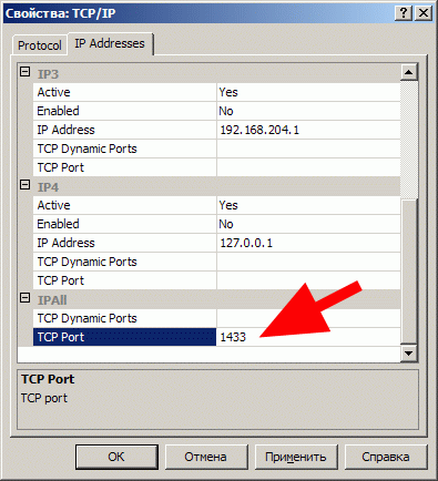 Также необходимо установить порт 1433 (или другой) в свойствах протокола: