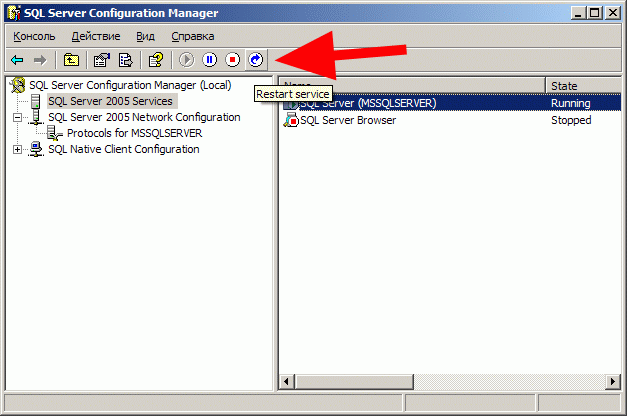 После чего необходимо перезапустить сервис MSSQLSERVER:
