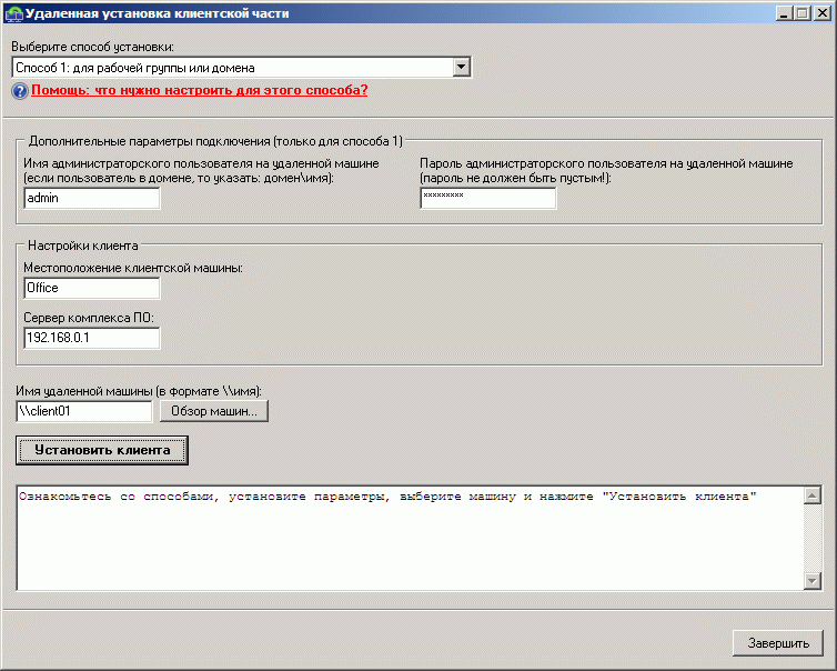 Общее описаниеВнимание! Выбор данного пункта установки доступен на начальной странице расширенной установки комплекса:![]() Вы можете установить клиента на удаленные машины рабочей группы или домена. При этом предусмотрено четыре различных способа в программе установки, выберите наиболее подходящий для вас. Для удаленной установки, возможно, потребуется сделать ряд предварительных действий (особенно актуально для рабочей группы), информацию о которых см. далее по каждому способу установки. См. также "Автоматическое развертывание в среде Active Directory" Программа удаленной установки имеет следующий вид (см. ниже). При этом настройки клиента полностью совпадают с настройками при локальной установке. ![]() Удалить клиентскую часть можно только через программу "БОСС-Онлайн". Изменить настройки можно повторно запустив программу установки, либо через программу "БОСС-Онлайн". |
