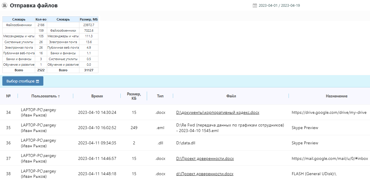 Отправка файловВ отчёте отражаются файлы, отправленные через сайты-файлообменники, вложения к письмам через почтовые сайты и почтовые программы, записанные на Flash-диск, отправленные через популярные мессенджеры.