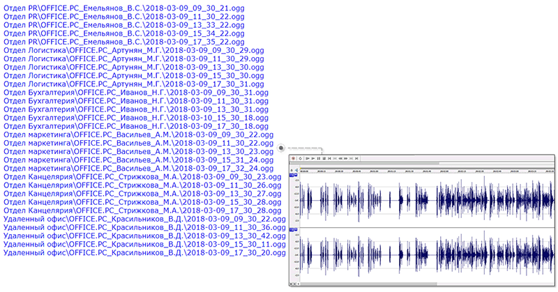 Файлы отсортированы по дате и по времени от начальной даты (верх списка) к конечной дате (низ списка). Аудиофайлы сохраняются в формате *.ogg. Для прослушивания данных аудиофайлов, рекомендуется предварительно сохранять их на свой ПК через правую кнопку мыши. Внимание! Для работы данного отчёта, необходимо чтобы были включены функции автопрослушки в
