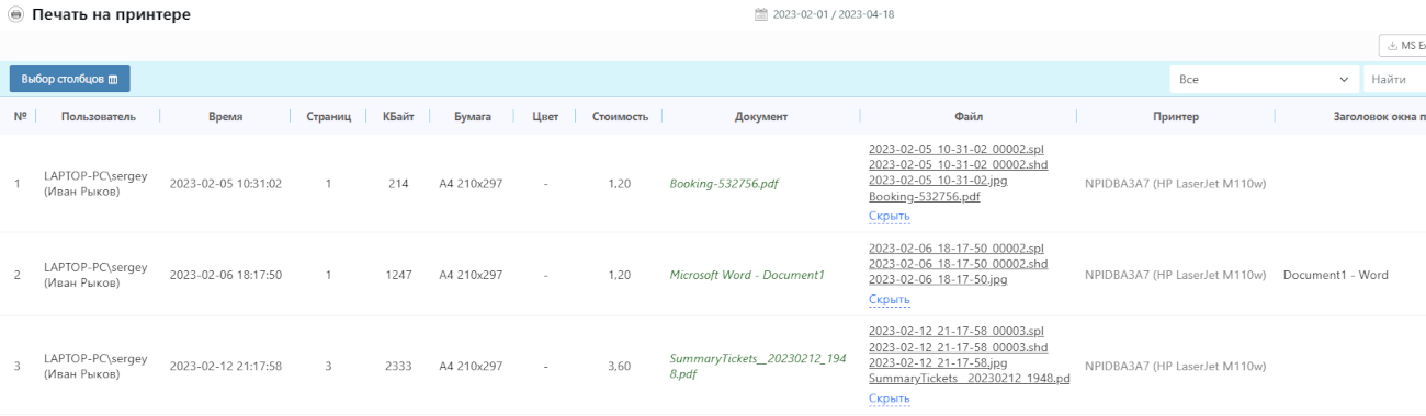 Отчёт показывает файлы, отправленные на печать выбранными пользователями, статистику печати за указанный период времени.