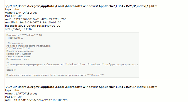 Поиск в файлахЕсли на компьютерах включено индексирование файлов-документов (см. настройки), то в любой момент можно произвести поиск по одному или группе компьютеров определенной поисковой строки.Если указать знак вопроса (?), то будет выдан текущий статус индексирования файлов с различной технической информацией (включая такой важный параметр как размер индекса - size). Формат поисковой строки см. здесь Если поисковый запрос найден, то будет выдан ответ в блочном виде, включая не только фрагменты найденного текста с выделенными искомыми словами, но и технической информацией: владелец файла, его размер, полный путь, дата изменения и т.п. ![]() |