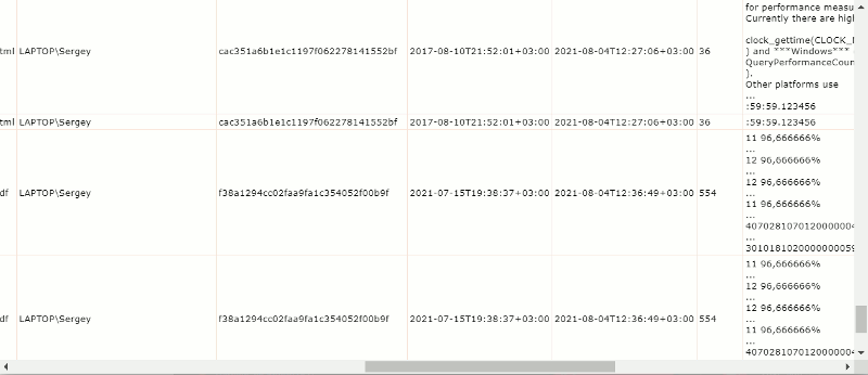 Поиск в файлахЕсли включен периодический поиск содержимого файлов на клиентских нашинах (см. настройки), то в данный отчет будут поступать результаты поиска (если что-то было найдено).Отчет строится по одному или группе компьютеров за выбранный промежуток времени. Следует обратить внимание на защиту от дублирующихся результатов поиска в данном отчете - чтобы один и тот же результат поиска не попадал в отчет при каждой итерации периодического поиска, существует параметр "Ретроспектива результатов" (см. настройки) Описание полей результатов: Положение+Машина - определяет ПК, на котором был произведен поиск; Файл - полный путь к найденному файлу; Флаги - различные флаги (например "encrypted" для зашифрованных файлов); Тип - тип (формат) файла; Владелец - владелец файла (системное поле для NTFS); MD5 - контрольная сумма MD5 для файла; Изменен - дата и время последнего изменения файла; Индексирован - дата и время индексирования файла поисковым механизмом; Размер - оригинальный размер файла в КБ; Фрагменты - один или несколько фрагментов текста файла, в которых были найдены ключевые слова (будут выделены в тексте) поиска или регулярные выражения. Отчет отсортирован по умолчанию по "имя ПК + время индексирования".