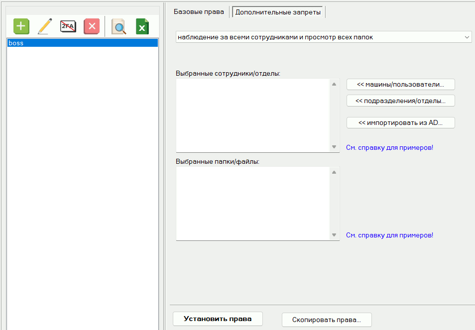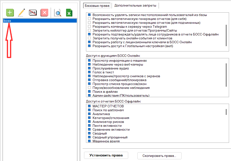 Пользователи базыНа этой странице можно добавлять начальников (хотя бы один обязателен!), а также дополнительных администраторов (при необходимости). Между собой они отличаются только правами доступа. Добавлять и изменять права можно только при входе под администратором базы данных!Добавление представляет собой создание нового пользователя в SQL-базе и назначение ему прав. Важное замечание: если какой-то пользователь уже есть в SQL-базе и вы хотите, чтобы он смог работать с базой СТАХАНОВЕЦ, то его необходимо обязательно добавить на этой странице, т.к. просто того, что он есть в базе SQL недостаточно для полноценной работы! Для MSSQL/PostgreSQL возможно также добавление учетных записей AD - укажите пользователя в формате DOMAIN\username (домен без точки в сокращенном виде - NETBIOS). Для PostgreSQL регистр имеет значение! (см. также LDAP для PostgreSQL) Созданные здесь начальники и дополнительные администраторы также могут входить в программу глобальных настроек, однако не смогут добавлять/удалять пользователей и устанавливать их права. Это может делать только администратор базы данных! Пример создания начальника "boss": ![]() Наиболее важные опции в правах начальника: Возможность удалять записи местоположений пользователей из базы Разрешить или запретить работу на странице "Списки пользователей". Разрешить автоматическую генерацию отчетов (для себя) Разрешает автогенерацию отчетов по своим подчиненным с отправкой отчетов себе (или сохранением в папку). Более подробно описано в справке описания серверных настроек "Генератор отчетов". Разрешить автоматическую генерацию отчетов (для подчиненных) Разрешает автогенерацию отчетов по своим подчиненным с отправкой отчетов самим подчиненным. Более подробно описано в справке описания серверных настроек "Генератор отчетов". Разрешить команды к серверу через Telegram Разрешает отправлять данному начальнику команды управления на сервер через мессенджер Telegram. Более подробно см. здесь Разрешить подтверждать/удалять лица сотрудников в отчете БОСС-Оффлайн Используется для отчета распознавания лиц. Отключение 2FA Более подробно см. здесь Отдельно рассмотрим "Дополнительные запреты" в разделе назначения прав для пользователей базы: ![]() По умолчанию созданный пользователь базы может наблюдать в режимах онлайн/оффлайн за всеми сотрудниками/отделами и смотреть все папки через БОСС-Оффлайн. Однако бывает полезно назначить для каждого пользователя базы (начальника) каких-то конкретных сотрудников или отделы для наблюдения. В этом случае можно выбрать такие отделы (и при необходимости сотрудников), аналогично и с папками при просмотре через БОСС-Оффлайн. Для выбора сотрудников можно воспользоваться кнопкой "машины/пользователи" (пока в базу не поступили данные от сотрудников, данный список будет пуст!), вводить данные вручную или импортировать из Active Directory (см. также здесь). Для выбора отделов - кнопкой "подразделения/отделы" (создается структура компании в соотв. пункте глобальных настроек). Примечание: права на отдел распространяются также рекурсивно на все его дочерние отделы. Примечание: корневой отдел (название компании) не указывается в иерархическом пути отдела. Примечание: если добавлен отдел, то нет смысла добавлять отдельно всех пользователей/компьютеры внутри него. Каждая запись в списке должна начинаться с новой ст