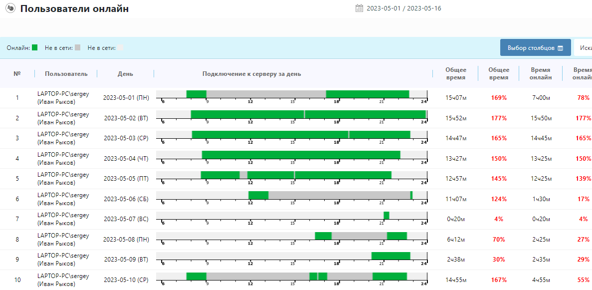 Отчет содержит следующую информацию: + Общее время, час/мин. Это время от первого подключения до последнего отключения от сервера в течение суток.+ Общее время, %. Рассчитывается по формуле: (Общее время час/мин) / (Кол-во рабочих часов + Перерыв (можно исключить здесь)) * 100 + Время онлайн, час/мин. Время, когда клиент пользователя был подключен к серверу. + Время онлайн, %. Рассчитывается по формуле: (Время онлайн, час/мин) / (Кол-во рабочих часов + Перерыв (можно исключить здесь)) * 100 + Начало. Время первого подключения к серверу. + Конец. Время последнего отключения от сервера. Кол-во рабочих часов и перерыва берется из настроек перед формированием отчёта. Внимание! Персональные графики работы имеют приоритет над опциями "Рабочие часы", "Начало дня", "Перерыв". Внимание! Для отображения данной информации необходимо чтобы была включена опция |