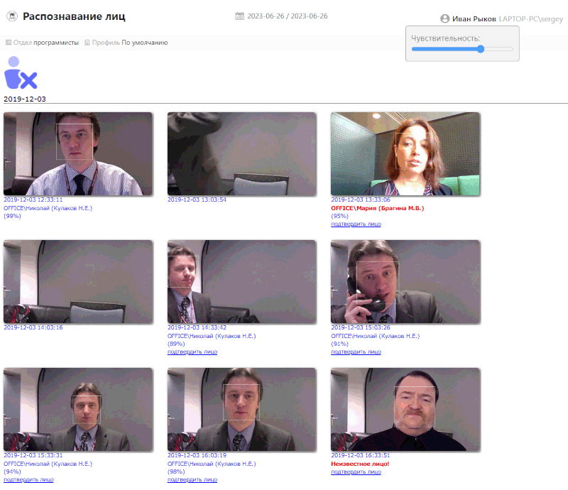 В случае, если за компьютером с открытой учетной записью текущего пользователя веб-камера сделает снимок с другим сотрудником, который также ранее был подтвержден в соответствующем отчете, пользователь будет выделен цветом с указанием доменного имени. Также для этих случаев в Глобальных настройках можно настроить события и уведомления.