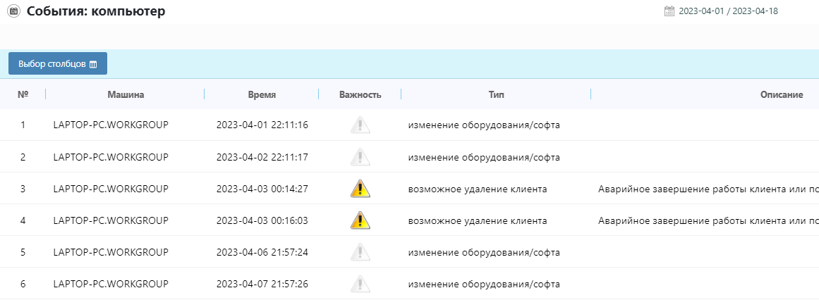 События - компьютерОтчёт отражает случаи срабатывания по определенным событиям на ПК, ранее настроенными администратором. Строится по выбранным устройствам за указанный период времени.