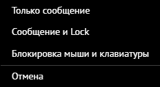 Сообщение и блокировкаЗдесь доступны следующие функции:![]() "Только сообщение" - отправка сообщения в виде Message Box пользователю; "Сообщение и Lock" - отправка сообщения на заблокированном экране (аналог нажатия Win+L); "Блокировка мыши и клавиатуры" - выдача сообщения пользователю (о блокировке администратором) и временная блокировка его клавиатуры/мыши (разблокировать можно нажав CTRL+ALT+DEL). Возможно для группы пользователей. |