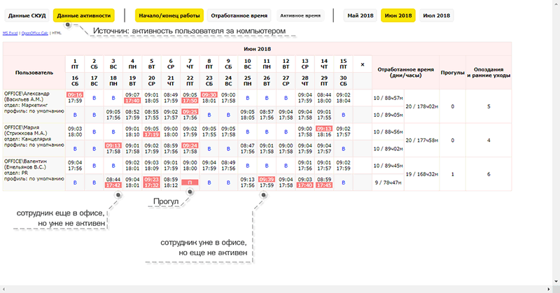 Можно получить информацию о фактическом времени работы пользователя за ПК и общем времени, проведенном в стенах офиса.